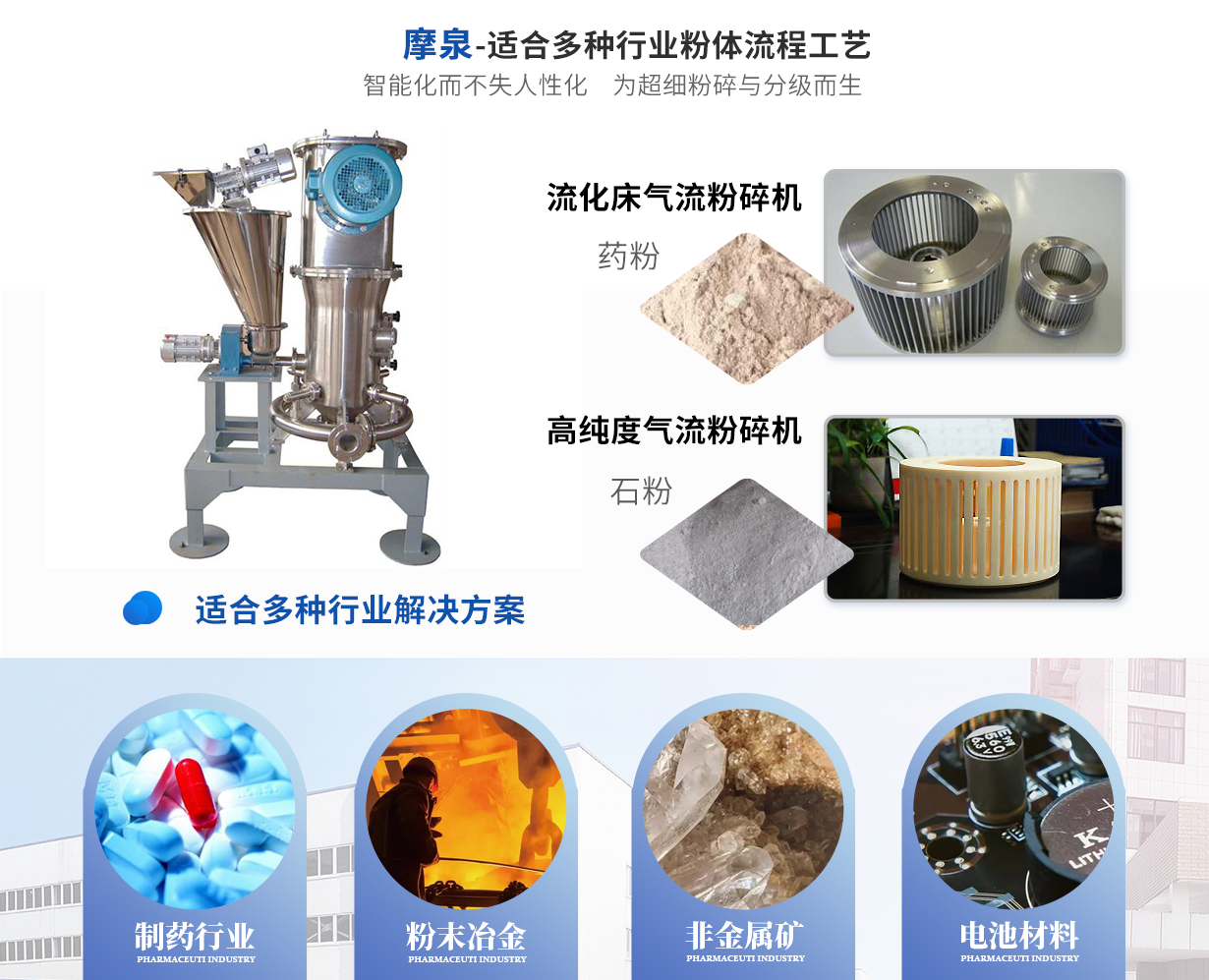 ●適合于莫氏硬度9以下的各種物料的干法粉碎,尤其適合于高硬度、高純度和高附加值物料的粉碎。